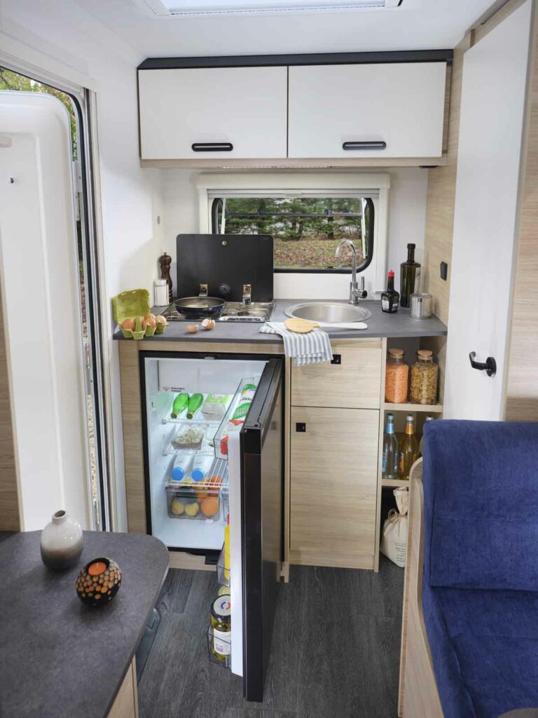 U zult graag leven, koken en rondreizen in deze perfect ingerichte caravan. De keukenruimte biedt een werkblad van 120 cm.