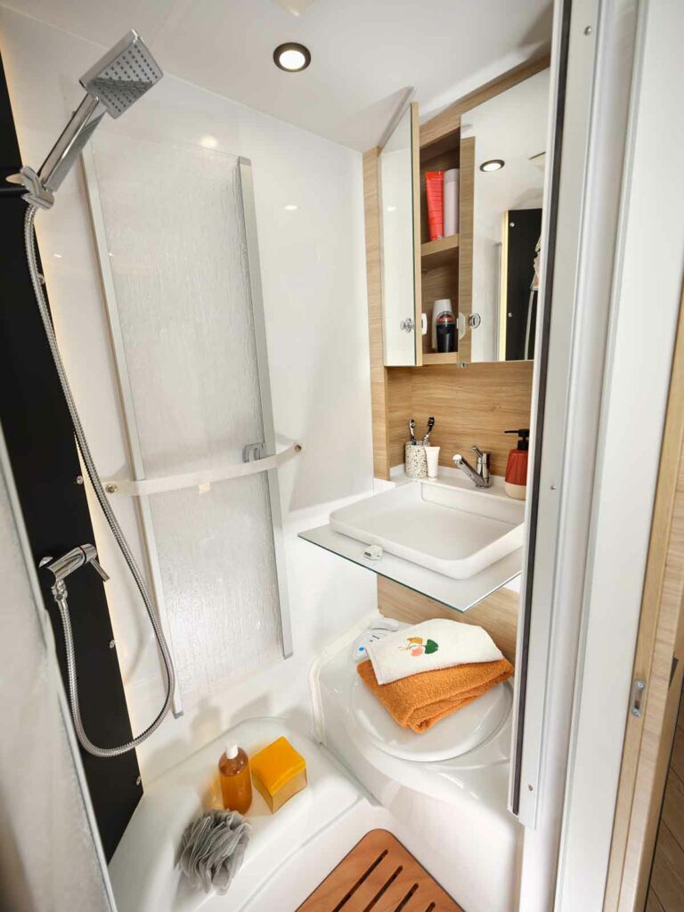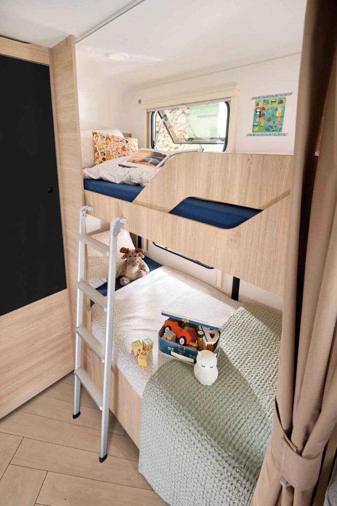 Stel je voor dat je voor deze caravan staat, open de deur en ontdek de geoptimaliseerde ruimte, het optimale slaapcomfort met een vast bed voor de ouders, stapelbedden en de dinette die kan worden omgebouwd tot een tweepersoonsbed voor de kinderen, de onafhankelijke en ruime badkamer. Je zult genieten van talrijke opbergruimtes en de fietsgarage om al je spullen te plaatsen.