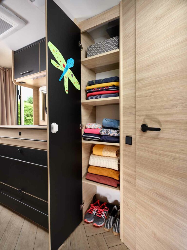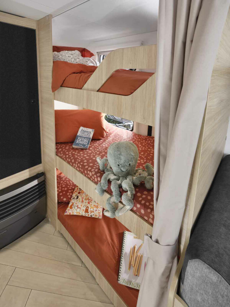 Met zijn drie stapelbedden achterin, een tweepersoonsbed voorin en een ruime ombouwbare zithoek, biedt de 497PE een ideale indeling voor grote gezinnen. Elke ruimte is goed gescheiden, zonder tegenover elkaar liggende bedden, voor meer privacy en vloeiendheid aan boord. Functioneel, goed uitgerust en ontworpen om lang mee te gaan.